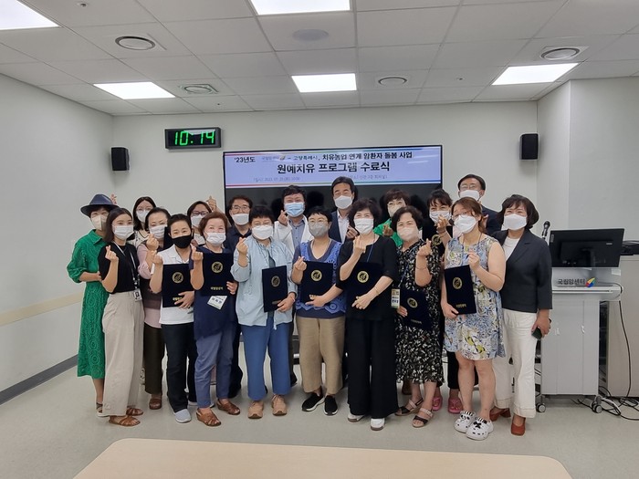 [부자동네타임즈 김인수기자] 고양시(시장 이동환)가 지난 7월 25일 국립암센터와 함께 암 환자 원예 치유농업 프로그램 수료식을 개최했다. 수료식에는 권지선 고양시 농업기술센터 소장, 김열 국립암센터 공공보건 의료사업단장 등 관계자와 14명의 수료생이 참석했다.