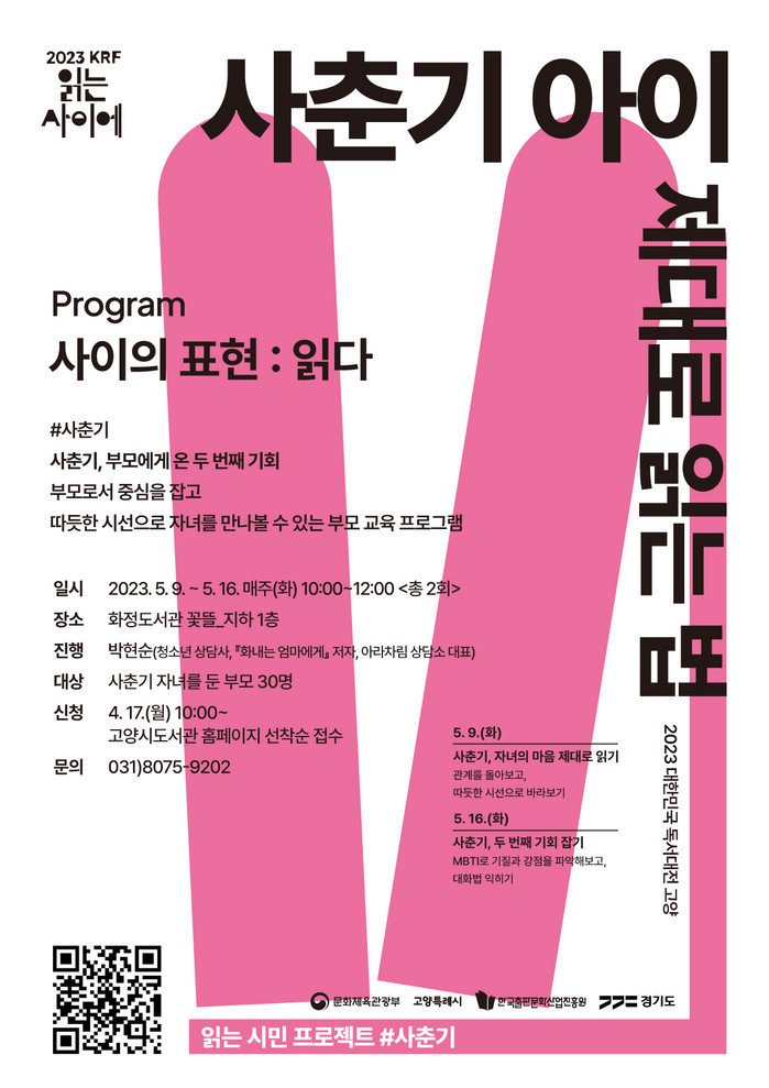 [부자동네타임즈 김인수기자] 고양특례시(시장 이동환)는 2023 대한민국 독서대전을 기념해 오는 5월 9일부터 화정도서관에서 ‘사춘기 아이 제대로 읽는 법’을 운영한다.