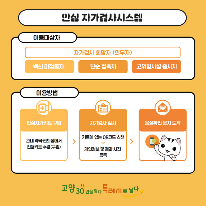 ㈜래피젠과 휴마시스㈜는 식약처의 승인을 받은 자가검사 키트 제조사로, QR코드가 인쇄된 전용 키트를 고양시에 공급하기로 했다. 해당 키트는 26일부터 관내 약국, 편의점에 순차적으로 납품된다.