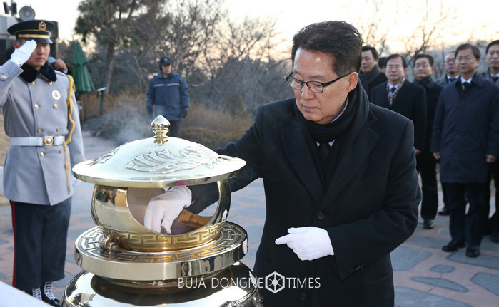 국민의당 박지원 신임 대표가 16일 오전 서울 동작구 국립서울현충원 김대중 전 대통령 묘소를 찾아 분향하고 있다. 2017.01.16