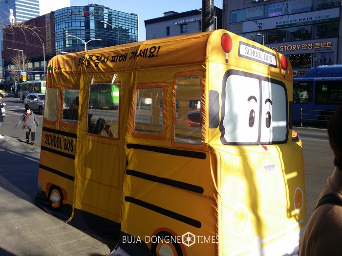 [부자동네타임즈 이병도 기자]강북구(구청장 박겸수) 수유역에 최근 노란색 스쿨버스 형태의 텐트가 등장해 화제가 되고 있다. 전체적으로 버스 형태를 띠고 있는 텐트는 전면에 귀여운 눈, 코, 입까지 달려있어 오가는 시민들의 시선을 한눈에 사로잡고 있다.