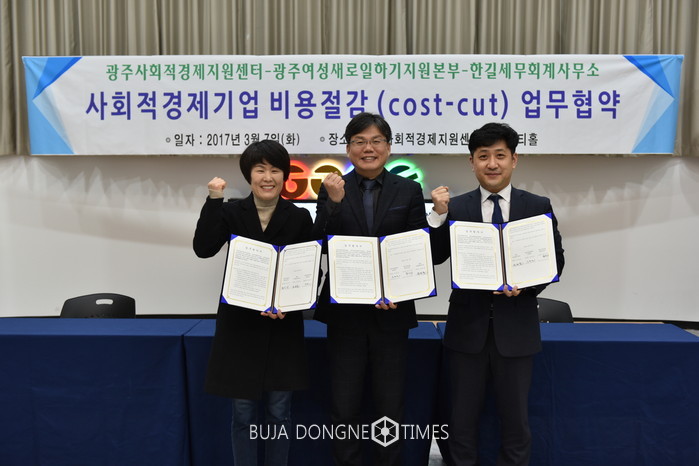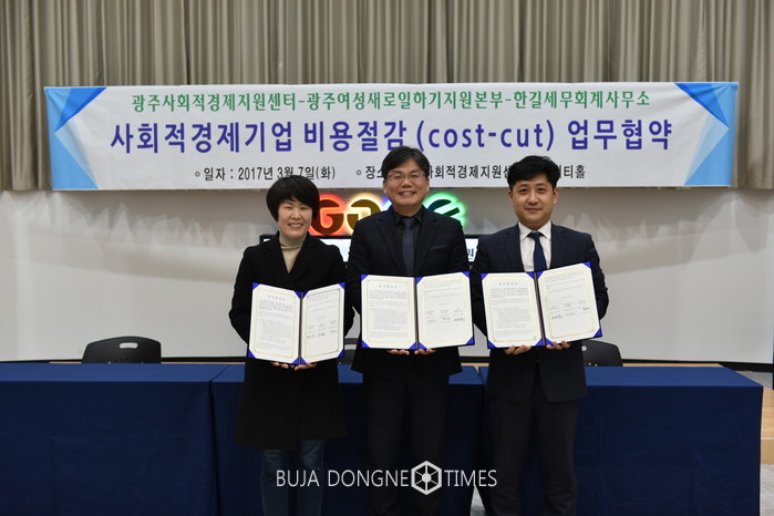 | △광주사회적경제지원센터는 광주여성새로일하기지원본부, 한길세무회계사무소와 「사회적경제기업 비용절감(cost-cut)」프로젝트를 위한 업무협약을 체결했다고 발표했다 |
