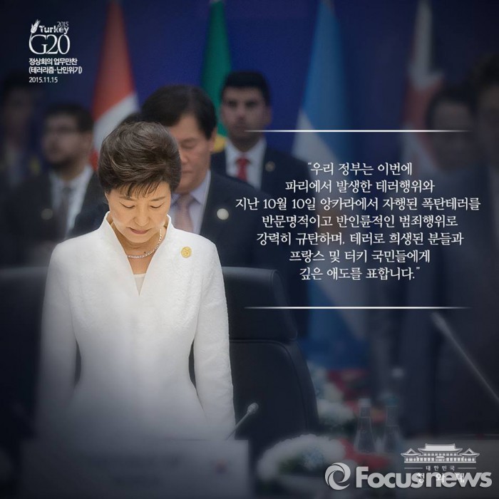 박 대통령은 또 한국계 입양아 출신인 플뢰르 펠르랭 프랑스 문화통신부 장관에게 "테러 희생자들에 대한 애도를 표하며 항상 프랑스와 함께 할 것"이라며 위로의 말을 건넸다.