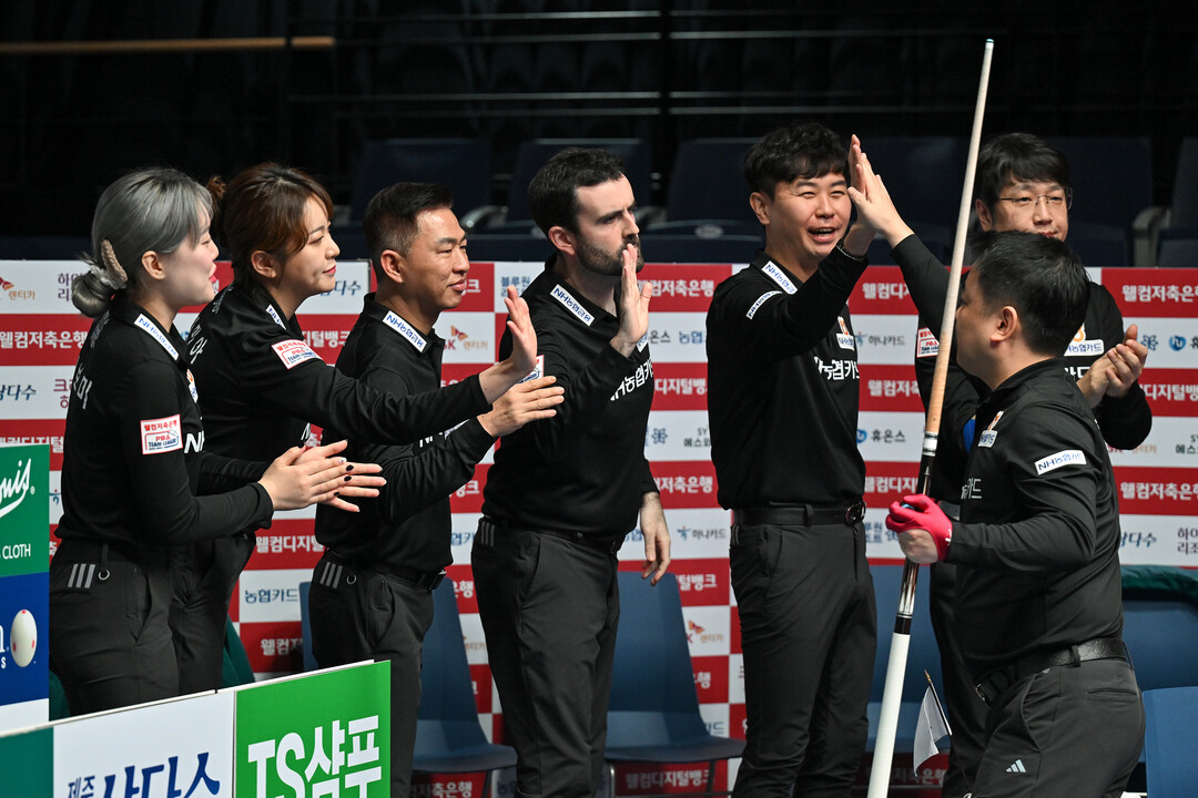이후 오성욱과 김보미가 팔라존-장가연을 9:7(10이닝), 5세트서는 안토니오 몬테스(스페인)가 김봉철을 6이닝만에 하이런 5점을 앞세워 11:6으로 물리치면서 세트스코어 4:1을 완성, 경기를 승리로 마무리했다.