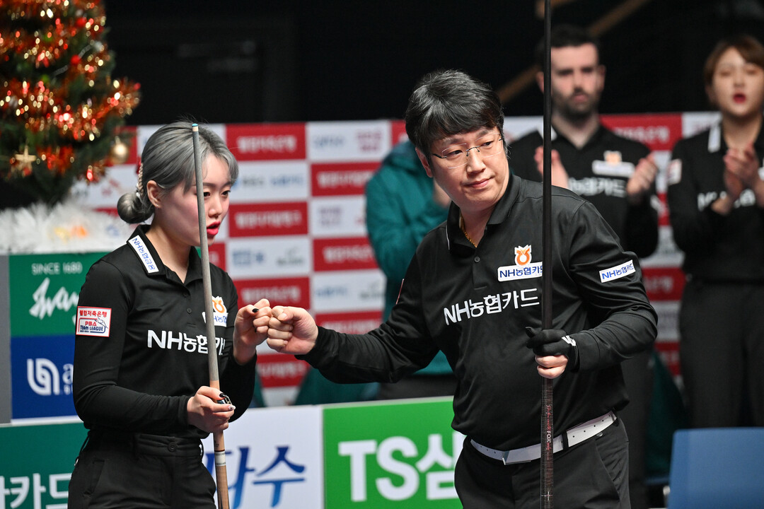 이날 NH농협카드는 첫 세트서 조재호가 9득점을 올리는 등 하비에르 팔라존(스페인)-최성원을 3이닝만에 11:2로 승리를 거두며 기분 좋게 출발했다. 휴온스는 2세트서 김세연-전애린이 김민아-김보미를 9:0(6이닝)으로 제압하면서 균형을 맞췄지만, 3세트서 세미 사이그너(튀르키예)를 상대한 조재호가 한 때 1:7로 뒤지던 상황을 15:9로 역전하며 분위기를 뒤집었다.