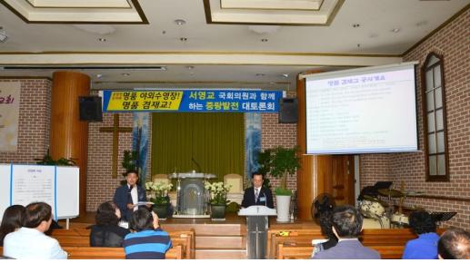 서울시의회 김태수 의원(새정연ㆍ중랑2)과 지역구 국회의원인 서영교 의원은 9일 중랑구 벧엘교회에서 ‘중랑천 둔치에 명품 야외수영장과 명품 겸재교’라는 주제로 중랑발전 간담회를 개최했다.
