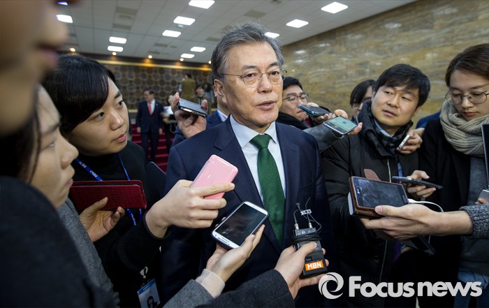 | △ 20대 총선 선거구 획정 여야 지도부 협상이 결렬된 지난 12일 오후 서울 영등포구 국회의사당에서 문재인 새정치민주연합 대표가 회동장을 나서며 취재진 질문에 답하고 있다. <사진제공=포커스뉴스> |