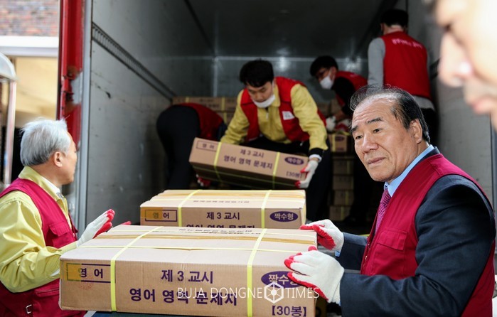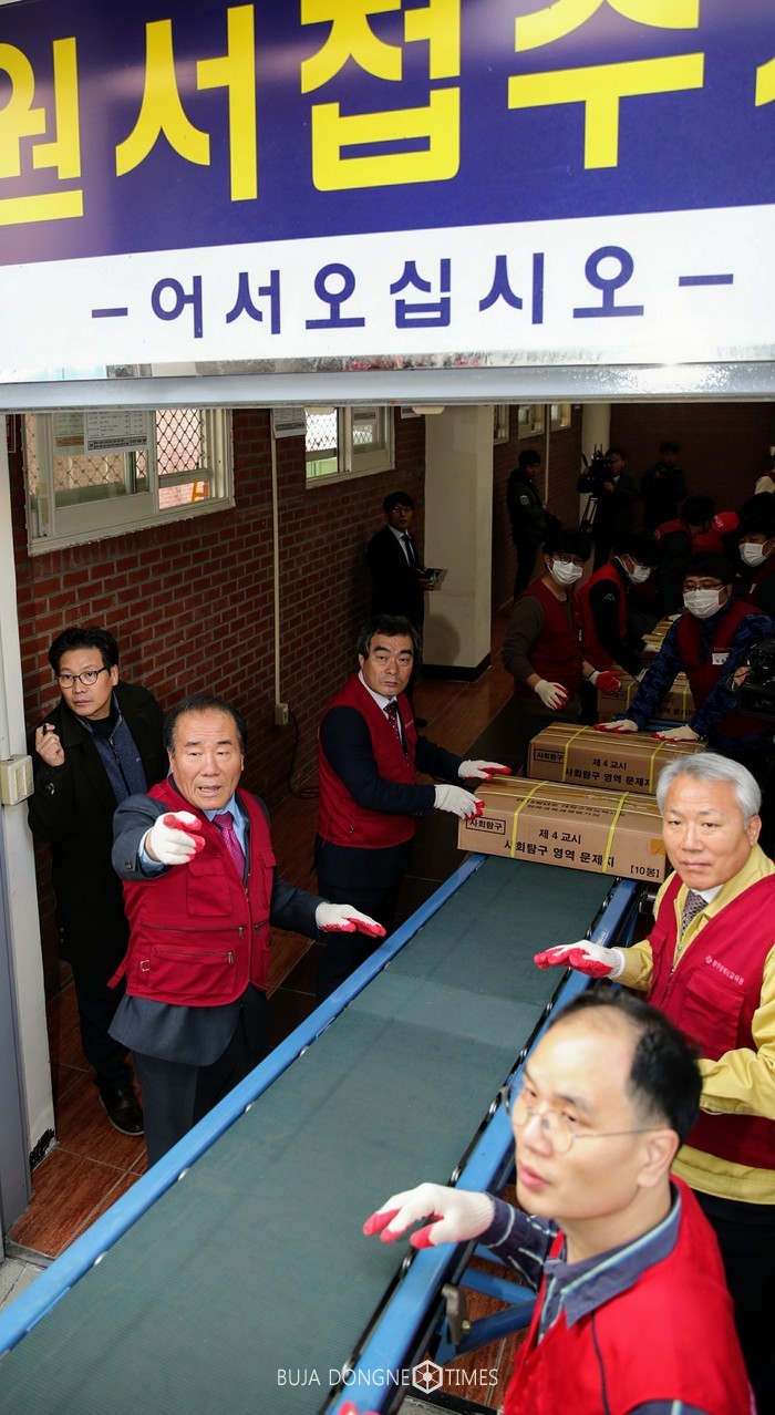 | △ 2018학년도 수학능력시험 문답지가 광주시교육청 원서접수처에 입고되었고, 그를 직접 장휘국 교육감이 직접 분류 작업을 진행하고 있다 |