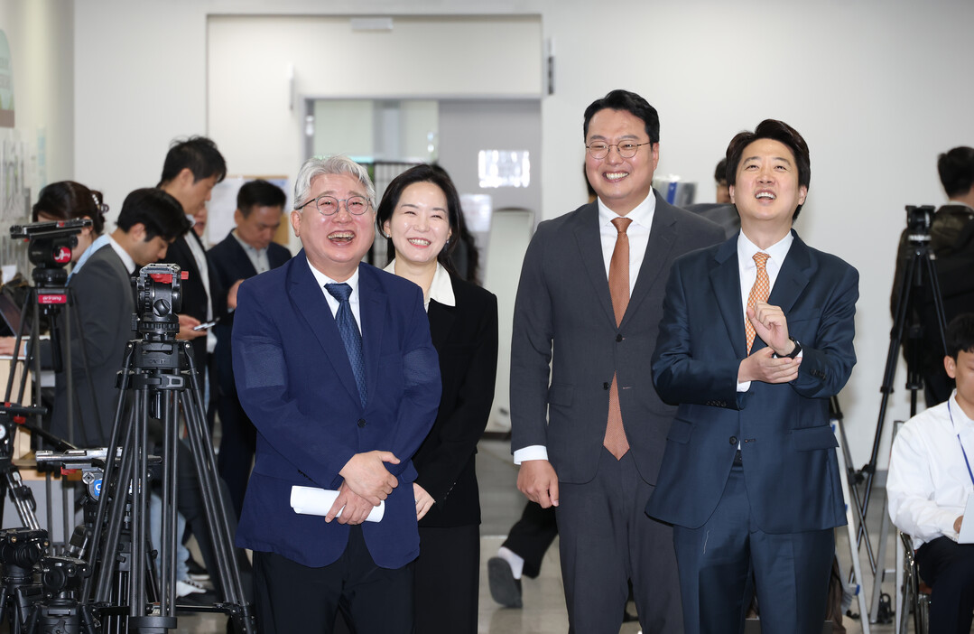 [부자동네타임즈 = 조영재 기자] 개혁신당 경기도지사 후보로 출마할 조응천 전 의원(왼쪽)이 28일 국회 소통관에서 출마 기자회견을 하기 위해 이준석 대표, 천하람 원내대표와 입장하고 있다. 2026.4.28
