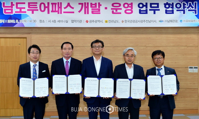 광주광역시와 전라남도, 한국관광공사 광주전남지사, (주)유비파트너스, (주)남해관광은 11일 오후 시청 4층 세미나실에서 고품격 남도관광 활성회 및 남도관광객 유치를 위한 '남도투어패스 개발·운영협약'을 실시했다.