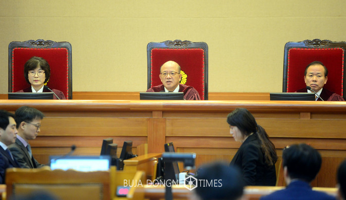 박근혜 대통령 탄핵심판 4회 변론기일인 12일 오전 서울 종로구 헌법재판소 대심판정에 박한철(가운데) 헌재소장이 발언을 하고 있다. 2017.01.12.