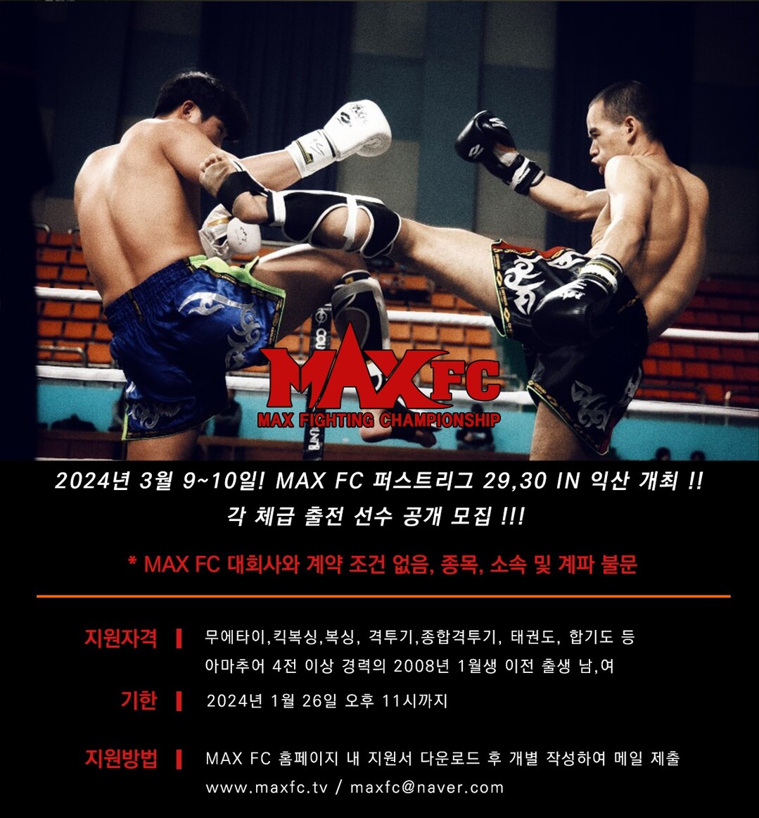 이번 ‘MAXFC 25 IN 익산’은 전북 익산시 익산실내체육관 특설링에서 진행되며, 관중 입장이 가능한 프로 대회로 개최된다. VIP석을 제외한 모든 좌석은 무료 입장으로 진행된다. 또, 준프로리그인 퍼스트리그와 신인전은 9일(토)과 10일(일) 양일간 개최 되며 1월 26일 까지 홈페이지를 통해 출전 신청을 할 수 있다.