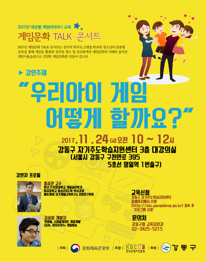 이번 행사에는 한국IT전문대학교 게임심리학과 홍성관 교수와 게임개발자이자 게임방송인으로 활동하고 있는 김성회 개발자가 강사로 참여해 “우리아이 게임 어떻게 할까요?”를 주제로 강연을 진행한다.