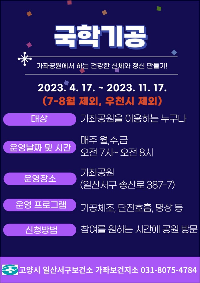 일산서구보건소 가좌보건지소팀 관계자는 “국학기공을 배우며 심신의 건강을 도모할 수 있도록 많은 참여를 바란다.”고 말했다.