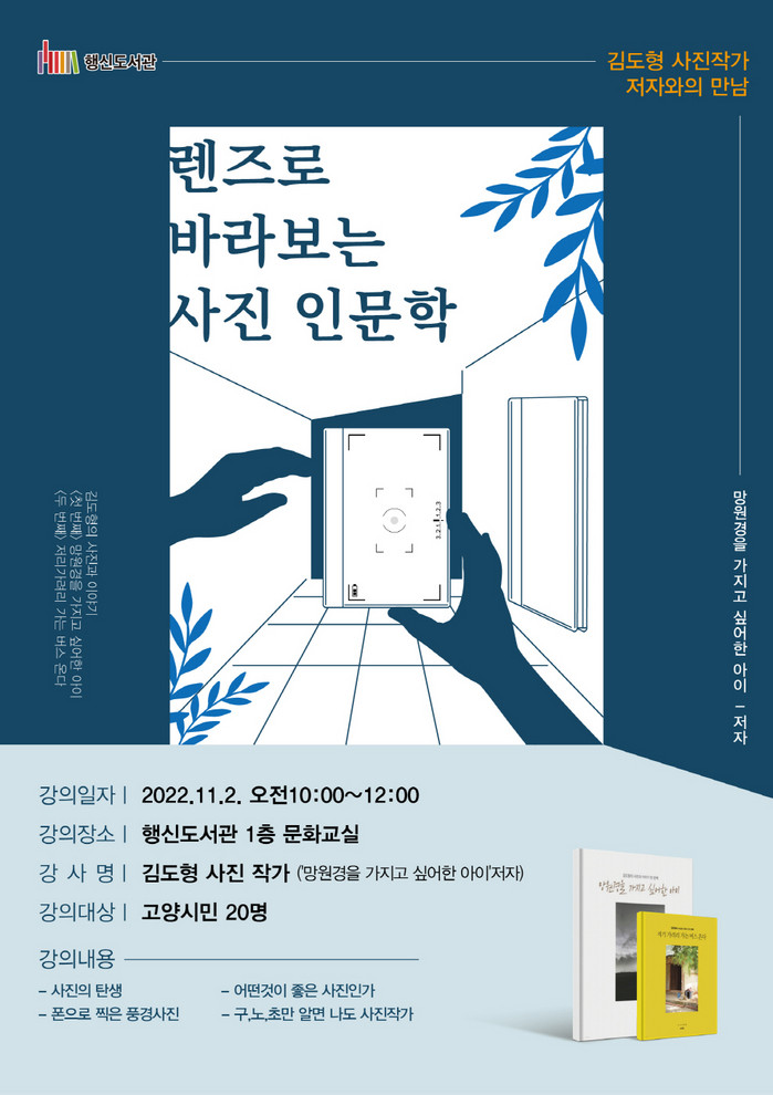 행신도서관 담당자는 “사진은 단순한 기록에서 나를 표현하는 수단으로 발전했다. 사진가이자 사진 인문학자인 김도형 작가와의 만남을 통해 좋은 사진을 찍는 실용적인 방법을 배우고 인문학적 소양도 키우는 좋은 기회가 될 것”이라고 말했다.