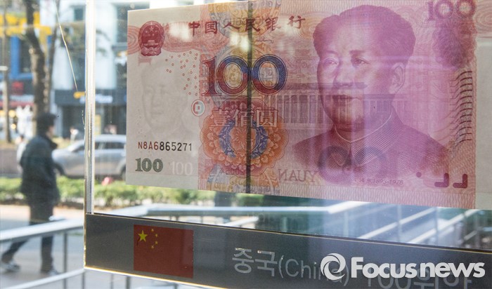 (서울=포커스뉴스) 중국 위안화의 국제통화기금 특별인출권(SDR) 통화바스켓 편입이 결정된 1일 오전 서울 중구 KEB 하나은행 로비에 전시된 중국 100위안화 너머로 시민들이 지나가고 있다.