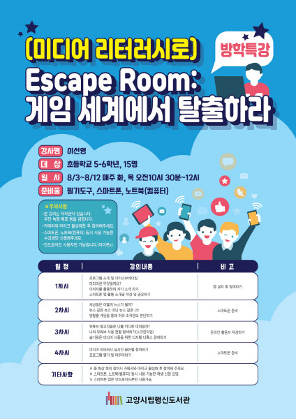 [부자동네타임즈 김인수기자] 고양시 행신도서관은 "여름방학을 맞이하여 초등학교 5~6학년을 대상으로 8월 3일(화)부터 미디어리터러시 강좌 미디어 리터러시로 Escape Room: 게임 세계에서 탈출하라를 운영한다."고 밝혔다.