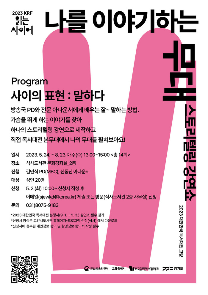 [부자동네타임즈 김인수기자] 고양특례시(시장 이동환) 식사도서관에서 오는 5월 24일부터 8월 23일까지 2023 대한민국 독서대전 개최를 기념해 스토리텔링 강연쇼 ‘나를 이야기하는 무대’를 진행한다.