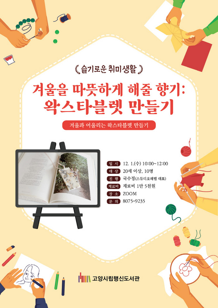 [부자동네타임즈 김인수기자] 고양시 행신도서관이 성인을 대상으로 12월 1일(수) 왁스타블렛 만들기 프로그램 슬기로운 취미생활: 겨울을 따뜻하게 해줄 향기를 운영한다.