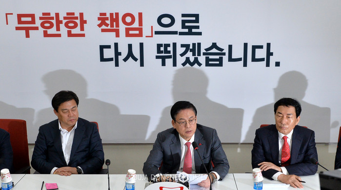 6일 오전 서울 여의도 국회 새누리당 원내대표실에서 정우택(왼쪽 두번째) 원내대표 주재 원내대책회의가 열리고 있다. 왼쪽부터 김선동 원내수석부대, 정 원내대표, 안상수 전국위원회부의장. 2017.01.06