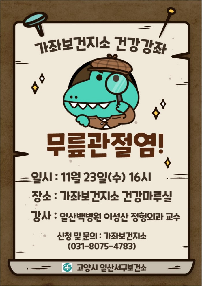 [부자동네타임즈 김인수기자] 고양특례시(시장 이동환) 일산서구보건소가 23일 16시에 가좌보건지소에서 ‘무릎관절염’ 건강강좌를 운영한다. 강의는 일산백병원 이성산 교수가 맡는다.