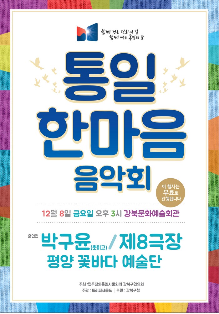 [부자동네타임즈 이병도 기자]민주평화통일자문회의 서울강북구협의회(회장 김상언)가 오는 8일(금) 오후 3시 강북문화예술회관 대공연장에서 ‘통일 한마음 음악회’를 개최한다.
