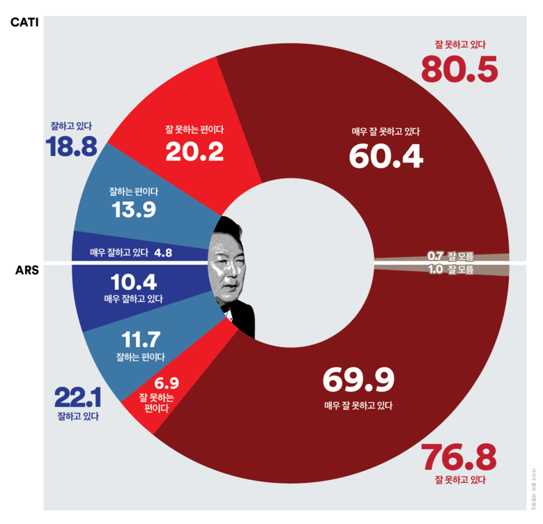 같은 시기에 진행한 ARS조사 결과 ‘긍정’평가는 0.3%p 하락한 22.1%, ‘부정’평가는 0.1%p 상승한 76.8%로 집계되었다(격차 54.7%p). 충청권과 대구·경북의 ‘긍정’평가가 각각 3.8%p, 9.3%p 상승했지만, 부·울·경과 강원·제주는 각각 3.7%p, 15.9%p 하락하며 3주 연속 ‘긍정’평가가 하락했고 충청권과 대구·경북의 ‘부정’평가가 하락했지만 강원·제주의 ‘부정’평가는 상승하며 모든 지역의 ‘부정’평가가 압도적으로 우세했다. 연령별로 보면 50대 이하는 ‘긍정’평가 하락, ‘부정’평가 상승하며 50대 이하 전 연령대의 ‘긍정’평가가 10%대로 내려앉았다.