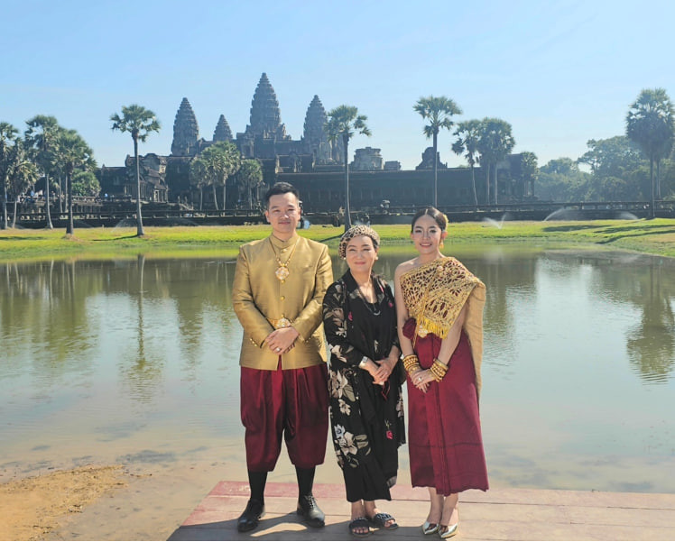 ▲사진 설명| 한-인도 비즈니스문화진흥원 (IKBCC: Indo-Korea Business Culture Center)과 글로벌외교관포럼(Global Diplomats Forum)의 제나 정(Dr. Zena Chung) 이사장이 이날 결혼식을 올린 캄보디아의 젊은 신랑·신부의 양가 부모와 함께 앙코르 와트 사원 야외에서 기념 촬영을 하고 있다.