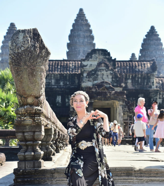 ▲사진 설명| 한-인도 비즈니스문화진흥원 (IKBCC: Indo-Korea Business Culture Center)과 글로벌외교관포럼(Global Diplomats Forum)의 제나 정(Dr. Zena Chung) 이사장이 캄보디아 시엠립의 앙코르 와트 사원을 방문해, 전 세계가 하나의 지구 공동체이자 하나의 가족임을 뜻하는 ‘바수 데이바(Vasudhaiva Kutumbakam)’의 정신을 담아 두 손으로 하트 모양을 만들고 인류애를 향한 사랑을 전하고 있다.
