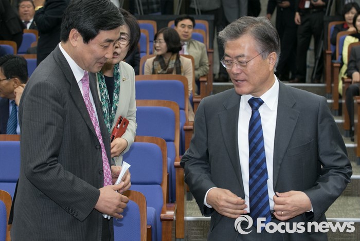 | △ 문재인(오른쪽) 새정치민주연합 대표와 이종걸 원내대표가 5일 오전 서울 여의도 국회에서 열린 의원총회에 참석하고 있다. <사진제공=포커스뉴스> |