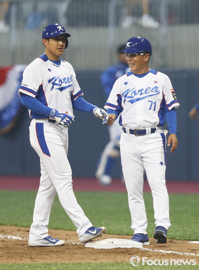 | △ 지난달 4일 오후 서울 구로구 고척스카이돔에서 열린 2015 서울 슈퍼시리즈 대한민국과 쿠바의 경기 5회말 2사 1루 상황에서 대한민국 대표 황재균이 빗맞은 안타로 1루 베이스를 밟고 있다. <사진제공=포커스뉴스> |