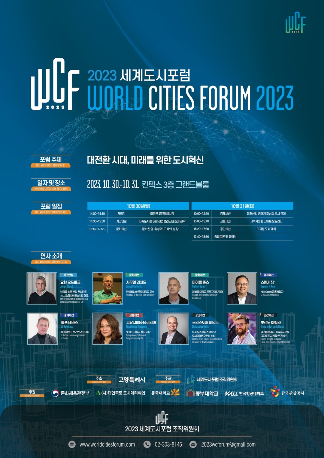 2023 세계도시포럼에서는 ▲북유럽실리콘밸리 시스타사이언스시티 전 씨이오(CEO) 요한 오드마크(Johan Odmark) ▲한류학자이며 펜실베니아 주립대학교 교수인 사무엘 리처드(Sam Richards) ▲케이에스브이 글로벌(KSV Global) 공동창업자인 스펜서 남(Spencer H. Nam) ▲럿거스 대학교 석좌교수 피유시미타 타쿠리아(Piyushimita Thakuriah) ▲뉴사우스웨일즈대학교 도시미래연구센터 소장 크리스토퍼 페티트(Christopher Pettit) 등이 주제 발표를 할 예정이다.