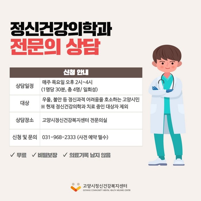 [부자동네타임즈 김인수기자] 고양특례시(시장 이동환) 정신건강복지센터에서 정신건강상담이 필요한 고양시민에게 ‘정신건강의학과 전문의 상담’을 실시한다. 상담은 우울, 불안, 스트레스, 코로나19로 인한 심리적 어려움 등 정신건강상의 어려움을 겪고 있는 고양시민이라면 누구나 무료로 이용이 가능하다.