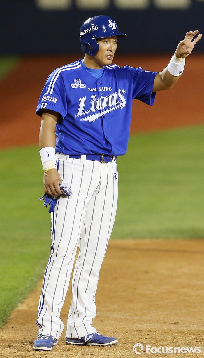 | △ 지난 8월 18일 서울 잠실구장에서 열린 삼성-두산전에서 4회초 무사 1,3루서 삼성 3루주자 이승엽이 1루로 사인을 보내고 있다. 우정식 기자 uhcho@focus.kr |