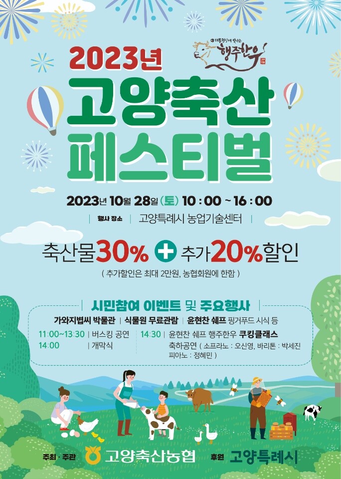 [부자동네타임즈 = 김인수 기자] 고양축산농협에서 주최하고 고양특례시(이동환 시장)가 후원하는 ‘2023 고양축산 페스티벌’이 오는 10월 28일(토) 고양특례시 농업기술센터에서 개최된다.