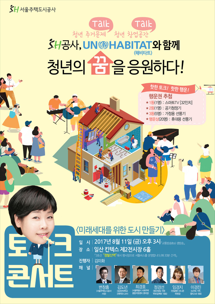 [부자동네타임즈 이채봉 기자]서울주택도시공사가 주최하고 UN해비타트가 함께하는 “청년의 꿈을 응원하다 !” 『미래세대를 위한 도시만들기 토크콘서트』가 오는 8월11일 오후 3시부터 일산 킨덱스 제2전시장(6홀)에서 개최된다.