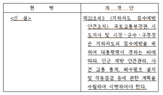 이에 최춘식 의원은 지하차도가 침수될 우려를 고려하여 국토교통부장관, 시도지사 및 시장ㆍ군수ㆍ구청장이 대통령령이 정하는 바에 따라, 1) 인근 제방 안전관리, 2) 사전 교통 통제, 3) 배수펌프 설치 및 작동점검 등에 관한 계획을 의무적으로 수립하여 이행하도록 하는 「지하안전관리에 관한 특별법 개정안」을 대표발의했다.