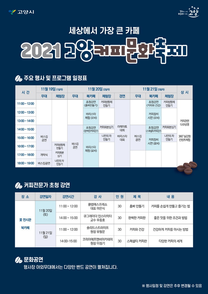 커피 전문가의 초청 강연은 온·오프라인으로 열리며 홈바 만들기, 완벽한 커피, 커피와 건강, 스페셜티 커피 등의 주제로 이뤄진다. 강연은 20일과 21일 양일간 오전 11시, 오후 2시에 일산호수공원 꽃전시관 북카페에서 진행되며 고양시 농업기술센터 유튜브 채널을 통해서도 참여할 수 있다.