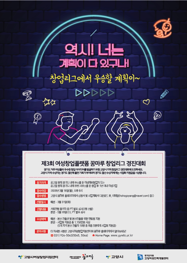 [부자동네타임즈 김인수기자] 고양시 (시장 이재준)는 고양시여성창업지원센터(센터장 유혜림)와 예비여성창업자와 새내기여성창업자의 참신한 창업아이디어 발굴과 창업지원을 위한 ‘제3회 여성창업플랫폼 창업리그 경진대회’를 개최한다고 밝혔다.