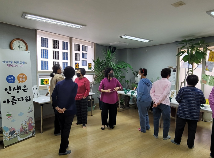 이날 전시회는 삼송마을 16단지에서 주 1회 진행된 미술수업에 참여한 어르신들이 그동안 만든 공예품, 수채화 등의 작품을 전시한 것으로, 단지 내 이웃들이 감상할 수 있도록 경로당 내부 공간을 활용하여 전시회를 개최했다.