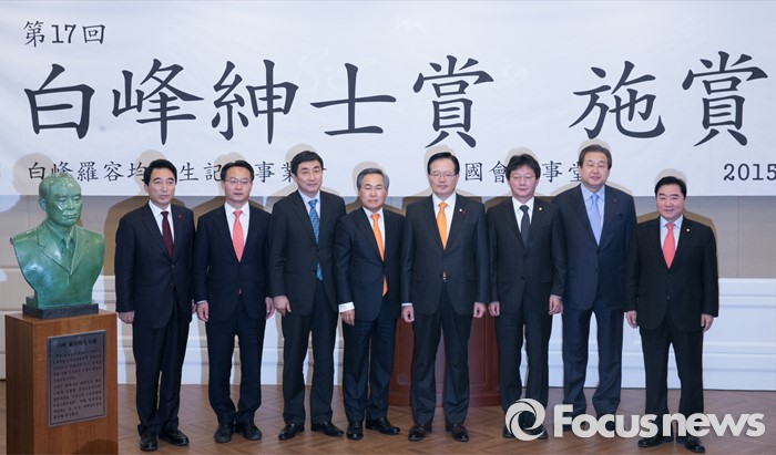 (서울=포커스뉴스) 8일 오전 서울 여의도 국회 귀빈식당에서 열린 17회 백봉신사상 시상식에 참석한 의원들이 기념촬영을 하고 있다. 왼쪽부터 박수현 새정치민주연합 의원, 조해진 새누리당 의원, 이종걸 새정치민주연합 원내대표, 우윤근 의원, 정의화 국회의장, 유승민 새누리당 의원, 김무성 대표, 이석현 국회 부의장.
