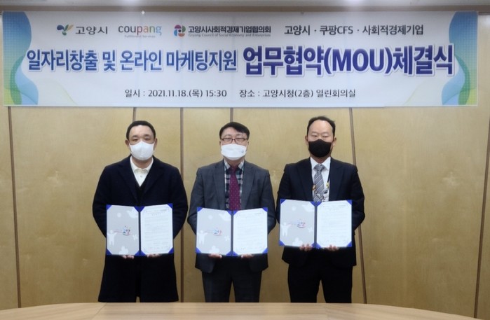 [부자동네타임즈 김인수기자] 고양시가 지난 18일(목) 쿠팡풀필먼트서비스(CFS), 사회적경제기업협의회와 업무협약을 체결했다.