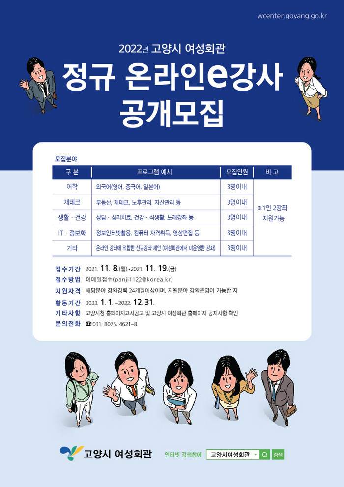 [부자동네타임즈 김인수기자] 고양시 여성회관이 2022년 정규 취.창업 강좌를 운영할 강사 10명, 온라인 강의를 진행할 강사 15명을 모집한다.