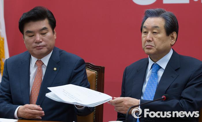 | △ 김무성(오른쪽) 새누리당 대표가 7일 오전 서울 여의도 국회에서 열린 최고중진연석회의에 참석해 원유철 원내대표에게 문서를 전달하고 있다. 박철중 기자 cjpark@focus.kr |