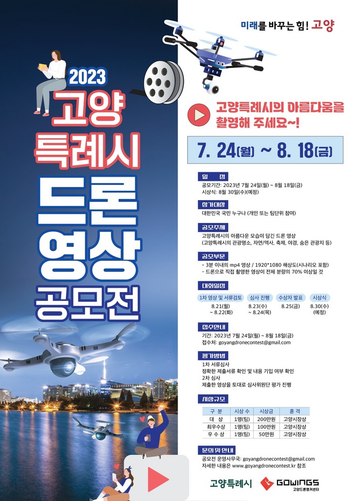 공모전은 대한민국 국민 누구나 개인 및 팀(2인 이내) 단위로 참여할 수 있다. 단, 드론 영상은 공모 기간 동안 고양시를 촬영한 영상만 인정된다. 총 상금은 350만원이다.