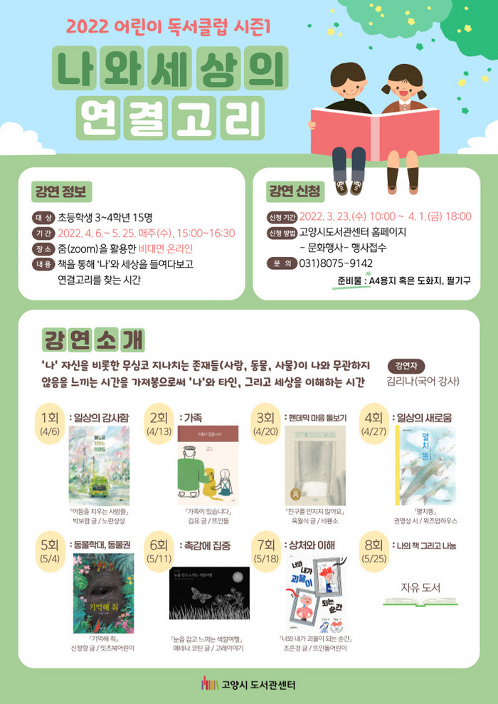 프로그램 신청은 3월 23일(수) 오전 10시부터 고양시도서관센터 홈페이지를 통해서 할 수 있으며 선착순 15명까지 가능하며, 회차별 주제 관련 그림책은 미리 읽고 와야 원활한 독후활동이 가능하다.