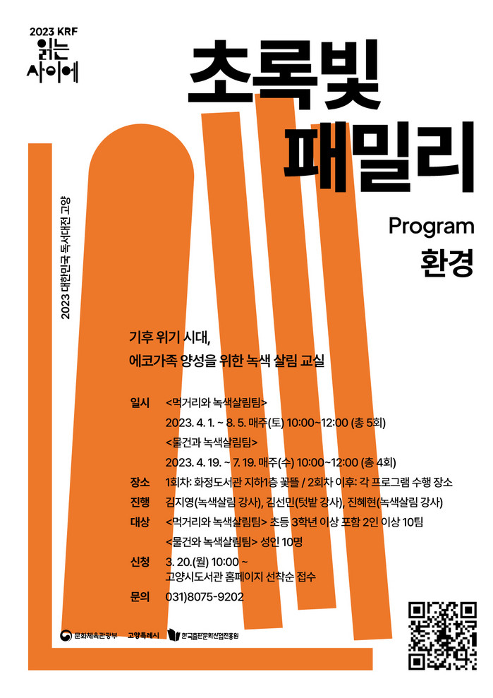 [부자동네타임즈 김인수기자] 고양특례시(시장 이동환) 도서관센터에서 2023 대한민국 독서대전을 기념해 녹색 살림교실 ‘초록빛 패밀리’를 운영한다. 센터는 3월 20일부터 선착순 모집한다고 밝혔다.