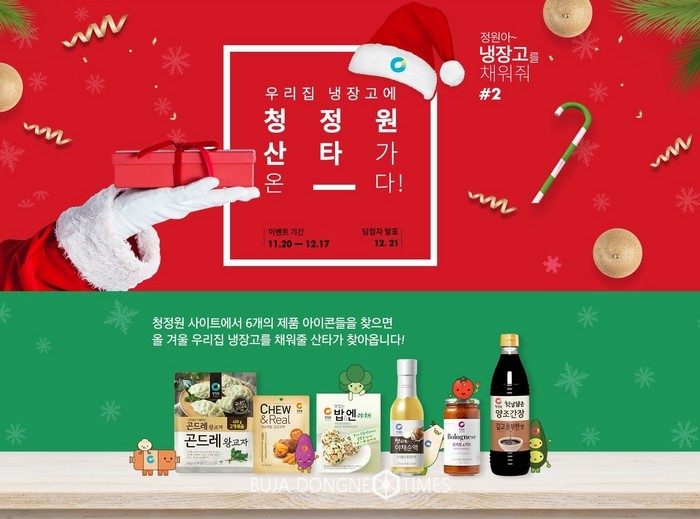 또한 ‘청정원 산타 소문내기’ 이벤트도 동시에 진행된다. 본인의 SNS를 통해 ‘냉장고를 채워줘’ 이벤트를 전체공개로 공유할 경우 추첨을 통해 선정된 30명에게 음료 모바일 기프티콘을 증정한다.