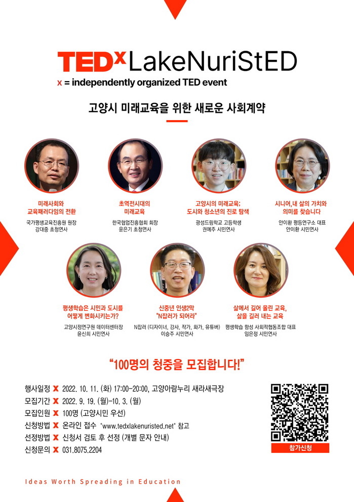 TED의 라이선스를 받아 독립적으로 조직된 ‘테드엑스호수누리길’은 평생교육 및 미래교육 전문가인 초청연사와 학생, 시민학습자 등 다양한 교육의 주체인 시민연사가 참여해 ‘고양시 미래교육을 위한 새로운 사회계약’을 주제로 발표할 예정이다.