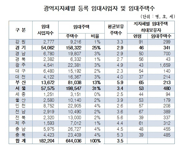 지역별로는 서울에 가장 많았다. 서울 임대주택수는 전체의 31%인 19만8547가구로 집계됐다. 경기가 15만8322가구(25%), 부산 8만1038가구(13%) 순이다. 서울과 경기, 부산 3개 광역자치단체가 전체 등록 임대주택의 68%를 차지했다.